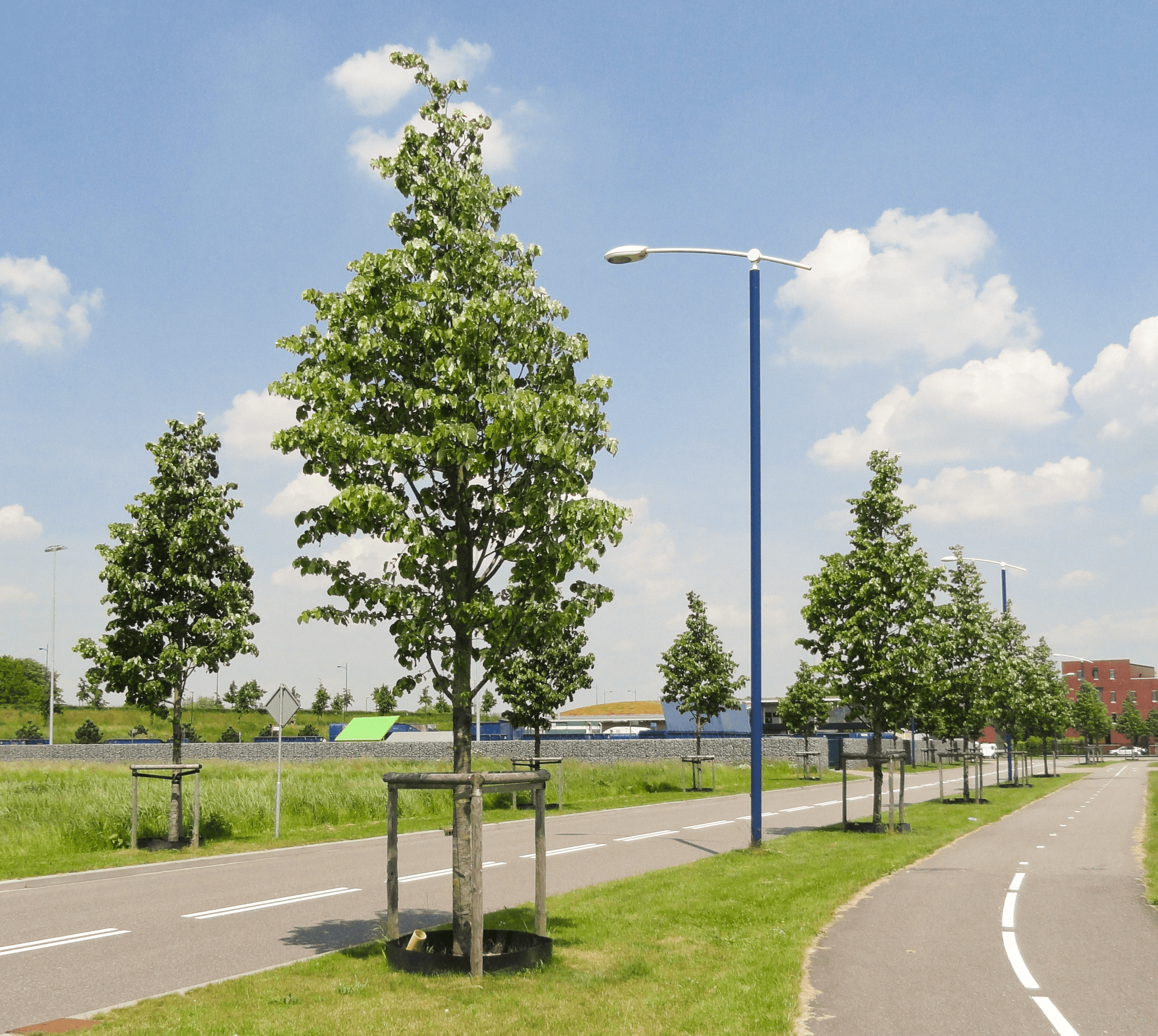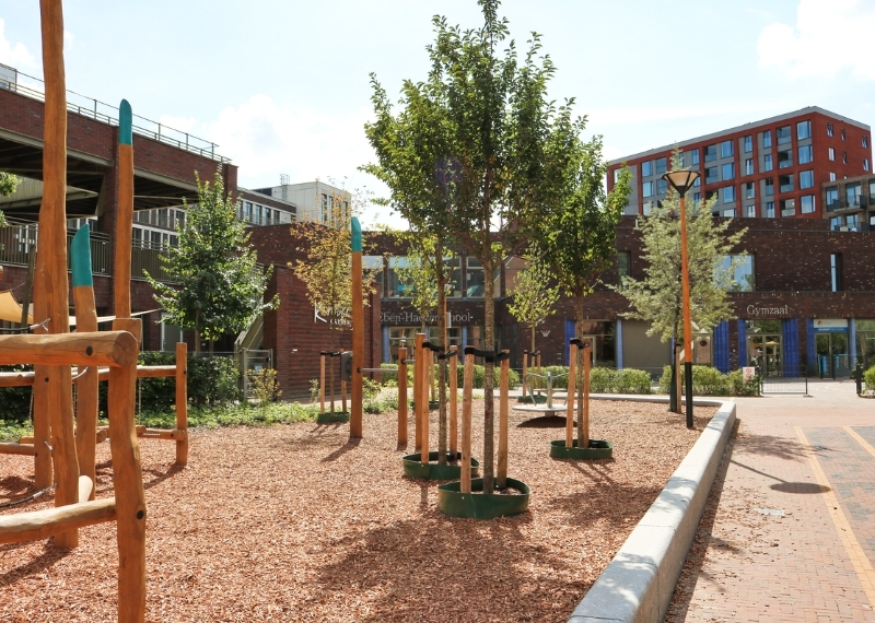 Bij diverse boomsoorten, zoals zuil-Amberbomen en lindebomen, zijn de gietranden van GreenMax toegepast. Gietranden fungeren als waterbuffer voor jonge bomen om ze een goede start te geven tijdens de eerste jaren van de groeifase. Het zorgt ervoor dat het water direct bij de wortels wordt opgenomen. Een senior toezichthouder van de gemeente Utrecht is tevreden met de staat van de beplanting na drie jaar: “Hoewel er enkele planten verloren zijn gegaan, met name in de vaste plantenvakken die aan de zonnige kant van het talud liggen, is dit slechts een klein percentage. Het was voornamelijk nodig om nieuwe planten toe te voegen aan deze zonnige plantenvakken”.