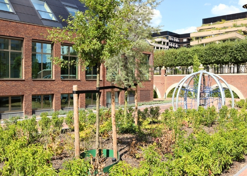 Het Plantsoen van Boedapest in Leidsche Rijn Centrum Utrecht is een meerlagige stadstuin die het zeven meter hoogteverschil tussen de historische Hofstede Ter Weide en het moderne Berlijnplein overbrugt. De tuin combineert groen, cultuur en recreatie, met onder het verhoogde park ruimtes voor creatieve ondernemingen en nestvoorzieningen voor vogels en vleermuizen. Dankzij slimme oplossingen, zoals extra plantdiepte in de daktuin, gietranden voor jonge bomen, kluitverankering voor stabiliteit en cortenstalen kantopsluiting, is een duurzame, biodiverse en veilige buitenruimte gecreëerd.