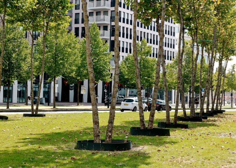 Inmiddels staan de bomen in volle bloei. Niet alleen de Trudo Toren zelf is een groene eye-catcher, ook rondom het gebouw bruist het van het groen. Zo zijn er prachtige bomenlanen, waarvan een aantal zijn omringd met de gietranden van GreenMax. De gietranden zorgen ervoor dat de bomen water effectief kunnen opnemen en geen droogtestress hebben tijdens warme zomermaanden.