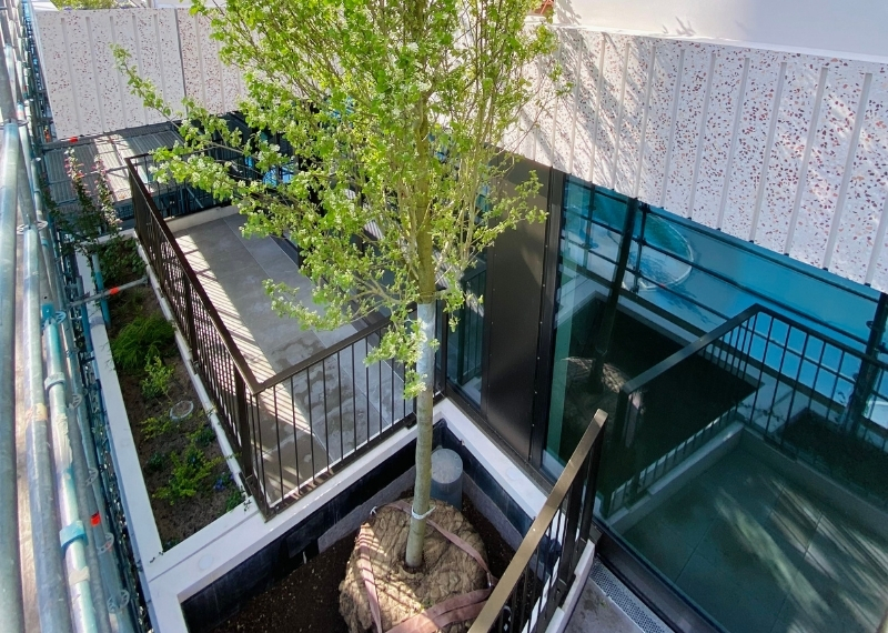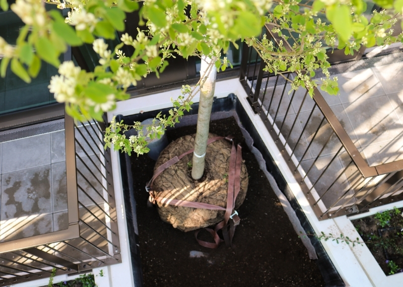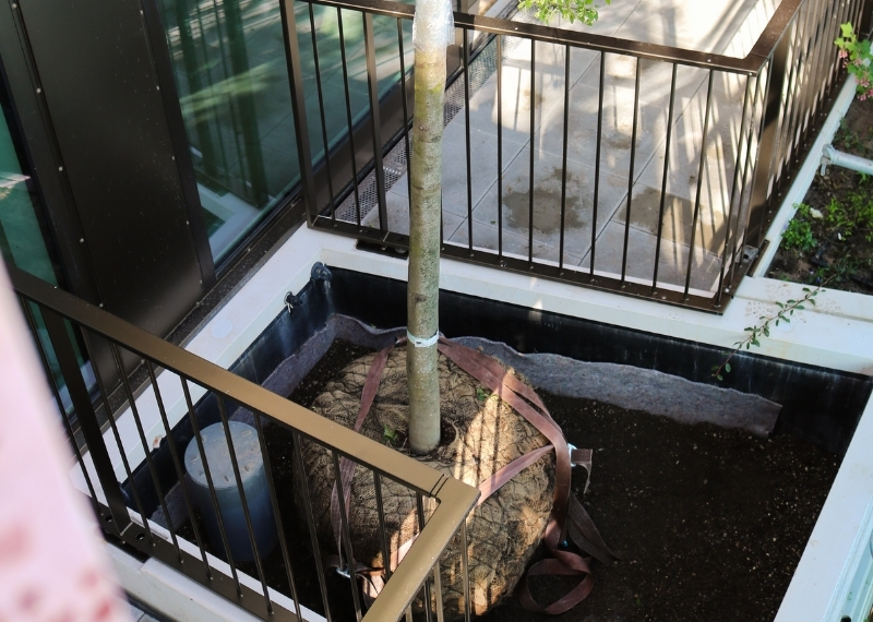 Het planten van bomen op torenhoge gebouwen vormt een uitdaging, aangezien ze op zulke hoogtes blootstaan aan harde wind. Om de bomen de nodige stabiliteit te bieden, is de innovatieve kluitverankering van GreenMax ingezet. Dit systeem zorgt ervoor dat de boomkluit stevig op zijn plaats wordt gehouden door stevige banden, waardoor de boom zelfs bij harde wind stabiel blijft staan. De kluitverankering is naadloos geïntegreerd in de bakken en wordt bedekt met een laag hoogwaardig boomsubstraat, waardoor deze met het blote oog niet zichtbaar is.