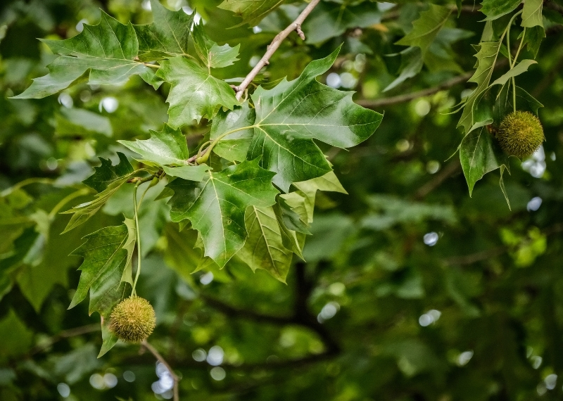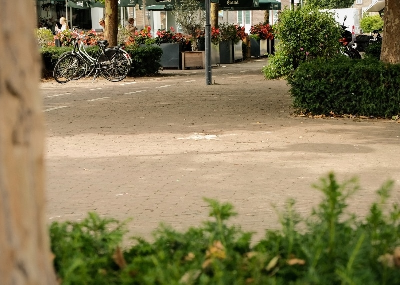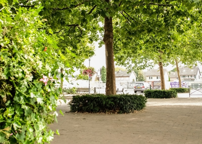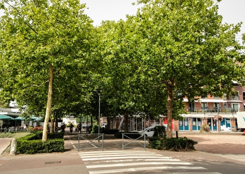 Dorpsplein met platanen in de openbare ruimte duurzaam beschermd tegen verhardingsschade